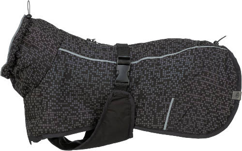 A poliészterből készült, könnyű párnázással ellátott kabát szélálló, ugyanakkor komfortos viselet. A hátoldalon található cipzár lehetővé teszi, hogy a kabátot hevederrel is kombinálhasd, így nincs szükség külön hámra a séta során. A nyak- és hátrésznél elhelyezett húzózsinórok révén tökéletesen a kutya testére igazítható, míg a praktikus haspánt csattal egyszerű és biztonságos rögzítést biztosít.